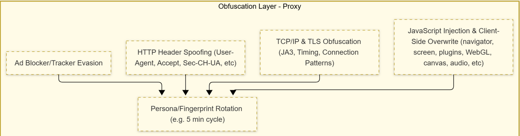 Provides a proxy with functionality to modify HTTPS headers, TLS Cipher Suite (JA4 Fingerprint), and intelligently inject JavaScript to mitigate JS fingerprinting techniques like canvas, audio context, and webGL.Currently, 404 operates using mitmproxy. There are instructions for installing their CA cert on their website, mitm.it. You must be routing traffic through mitmproxy to view this page.